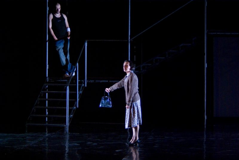Spaţiul, conceput arhitectural, cu scări, linii drepte şi ritmuri frânte, se proiecta peste fundalul video cu imagini în mişcare, cu câte o luminiţă ce licărea când la una dintre ferestrele blocului, când la alta, sau cu un etaj care aluneca vertiginos într-o parte. Personajele trăiau în acelaşi ambient, dar aveau propria viaţă şi propria mişcare browniană. Plecau şi se întorceau în acelaşi loc, dar în rest treceau unul pe lângă altul, cu trasee independente și interacţiuni superficiale. Scenele erau tipice, simple, lesne de înţeles. Pe scara blocului, Coca Bloos îi dădea cu poşetuţa în cap lui CRBL. Savuroasă în mecanica existenţei proprii condiţiei de pensionară, bătrâna interpretată de ea, iritată, cu simţurile la pândă, cu mers parcă mânat de poşetuţă, cu sunete onomatopeice, strecura, din când în când, câte un defensiv „Cine, eu?”. Într-un alt moment, la marginea scenei, actrița cojea şi mânca un ou, apoi mulţumea Cerului. Prin jocul bine distilat, expresiv, chirurgical simplificat, apariţia sa trimitea subtil, în pandant cu muzica lui Bach, la relaţia cu divinitatea.